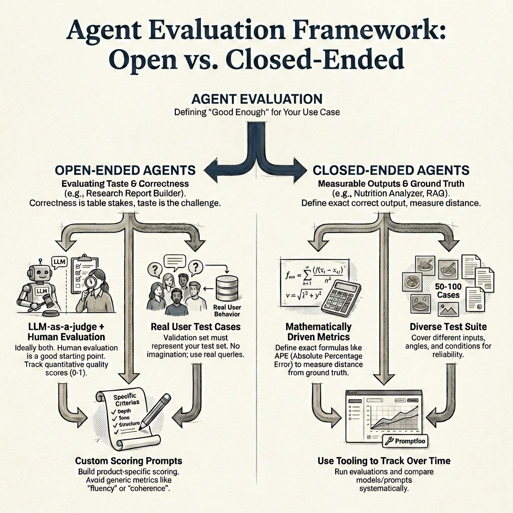 A framework I have found useful is to split agents into two categories - open-ended and closed-ended - because the evaluation approach is fundamentally different for each.