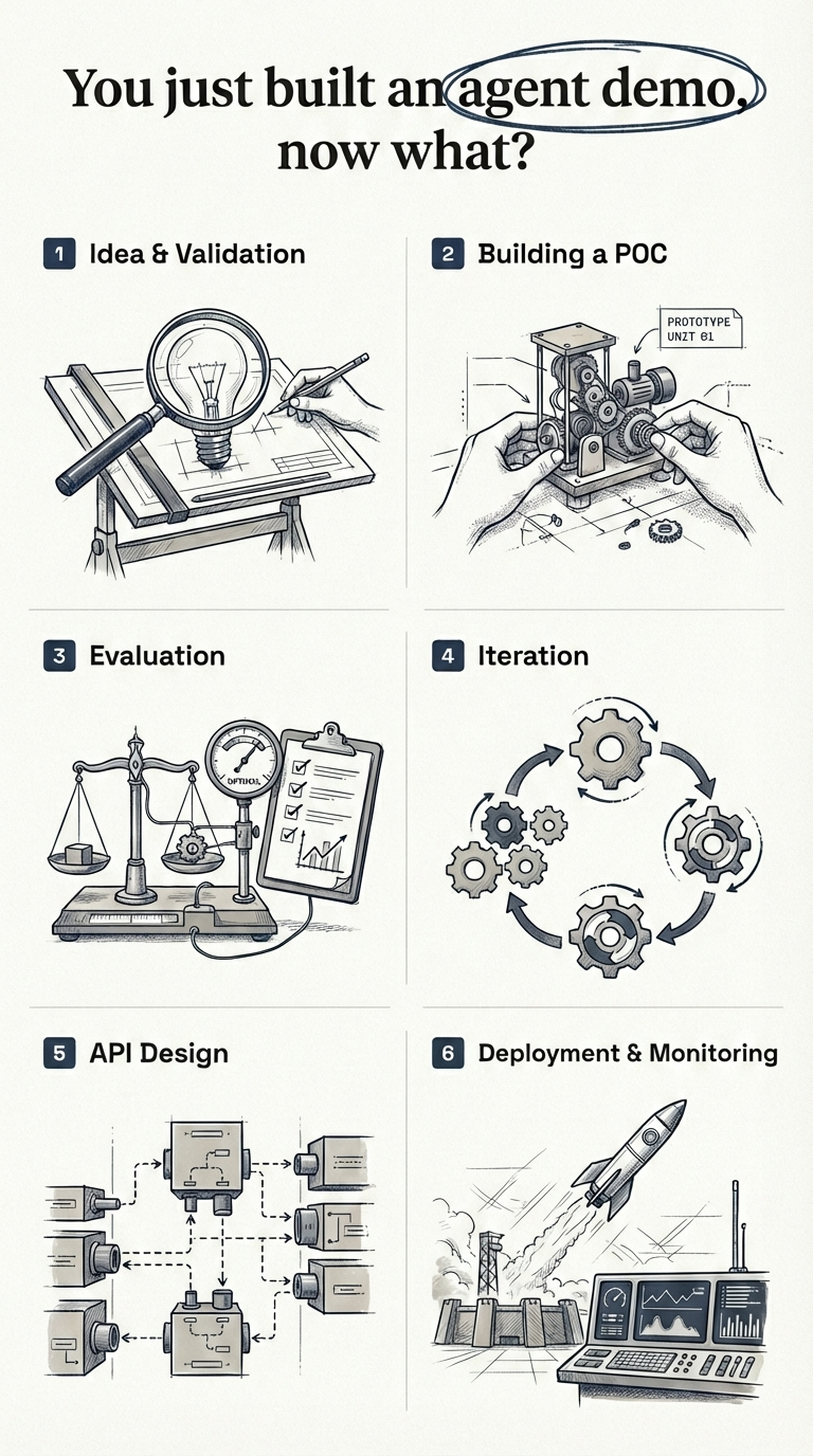 The road from demo to production has six stages: (1) Idea & validation, (2) Building a POC, (3) Evaluation, (4) Iteration, (5) API design, and (6) Deployment & monitoring. You want to spend the most time in step 3 and step 4 - this is where your agent goes from a working demo to a world class product.