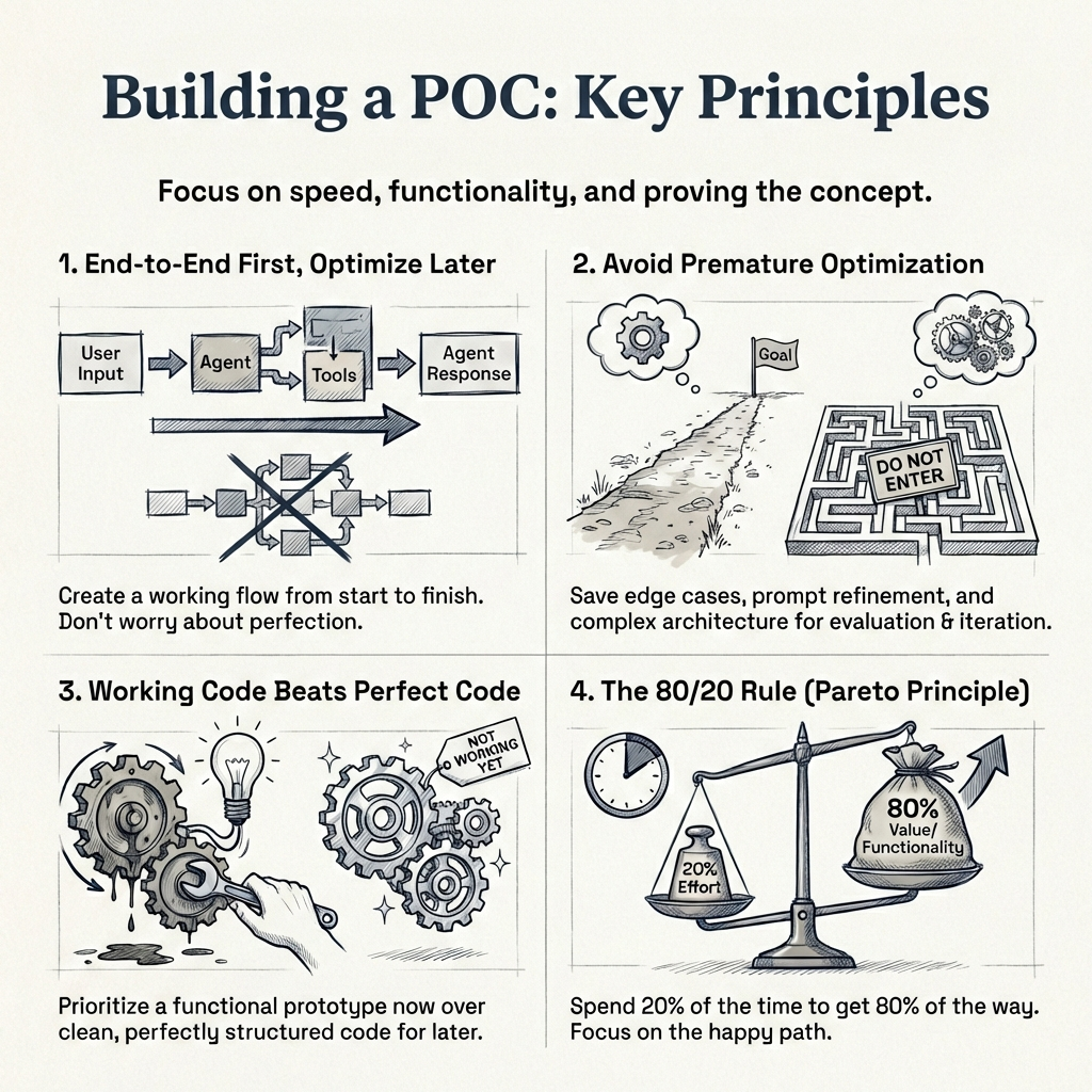 You want a working flow from the first user message to the final agent response. It does not need to be pretty. Your code does not need to be perfectly structured. Your system prompt does not need to cover every edge case. You might have ten tools defined when you only need seven - that is fine. You are in the POC phase, and refinement comes later.